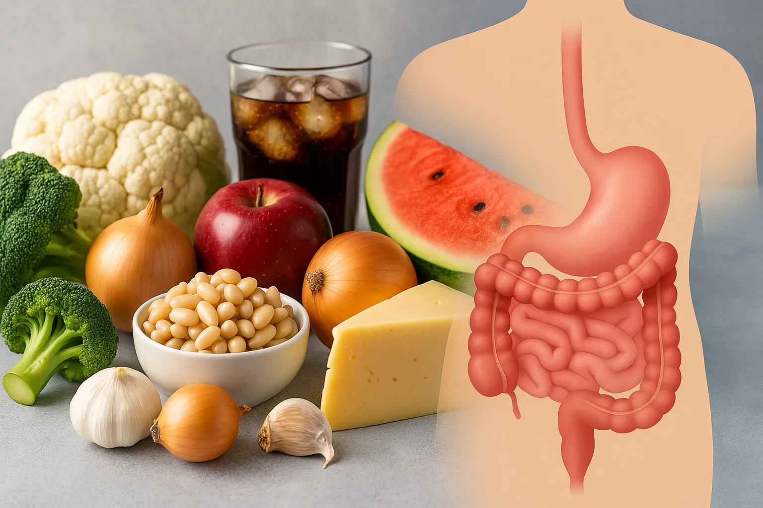 ذكر موقع Verywell Health الطبي أن بعض الأطعمة رغم فوائدها الصحية قد تؤدي إلى الانتفاخ، مثل الخضراوات الصليبية (البروكلي والقرنبيط)، والتفاح لاحتوائه على الفركتوز والسوربيتول، إضافة إلى منتجات الألبان التي تحتوي على اللاكتوز. كما تشمل القائمة الفاصولياء بسبب تخمر الألياف في الأمعاء، والمشروبات الغازية التي تُدخل الهواء للجهاز الهضمي، والثوم والبصل الغنيين بمركب “الفركتان”، وأخيرًا البطيخ الذي يحتوي على نسب مرتفعة من الفركتوز.