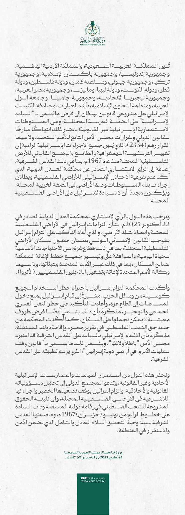 كما استند البيان إلى الرأي الاستشاري لمحكمة العدل الدولية الذي شدد على عدم شرعية الاحتلال وبطلان بناء المستوطنات وضمّ الأراضي في الضفة الغربية.