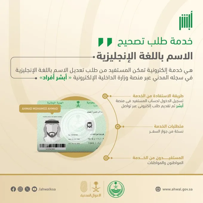 الأحوال المدنية توضح خطوات تصحيح الاسم باللغة الإنجليزية إلكترونياً عبر “أبشر”