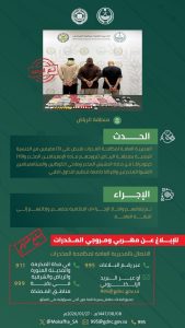 وأشارت المديرية العامة لمكافحة المخدرات إلى إيقافهم واتخاذ الإجراءات النظامية بحقهم، وإحالتهم إلى النيابة العامة.