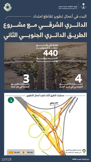 أعلنت «الهيئة الملكية لمدينة الرياض» بدء أعمال تطوير تقاطع امتداد الدائري الشرقي مع الطريق الدائري الجنوبي الثاني.
