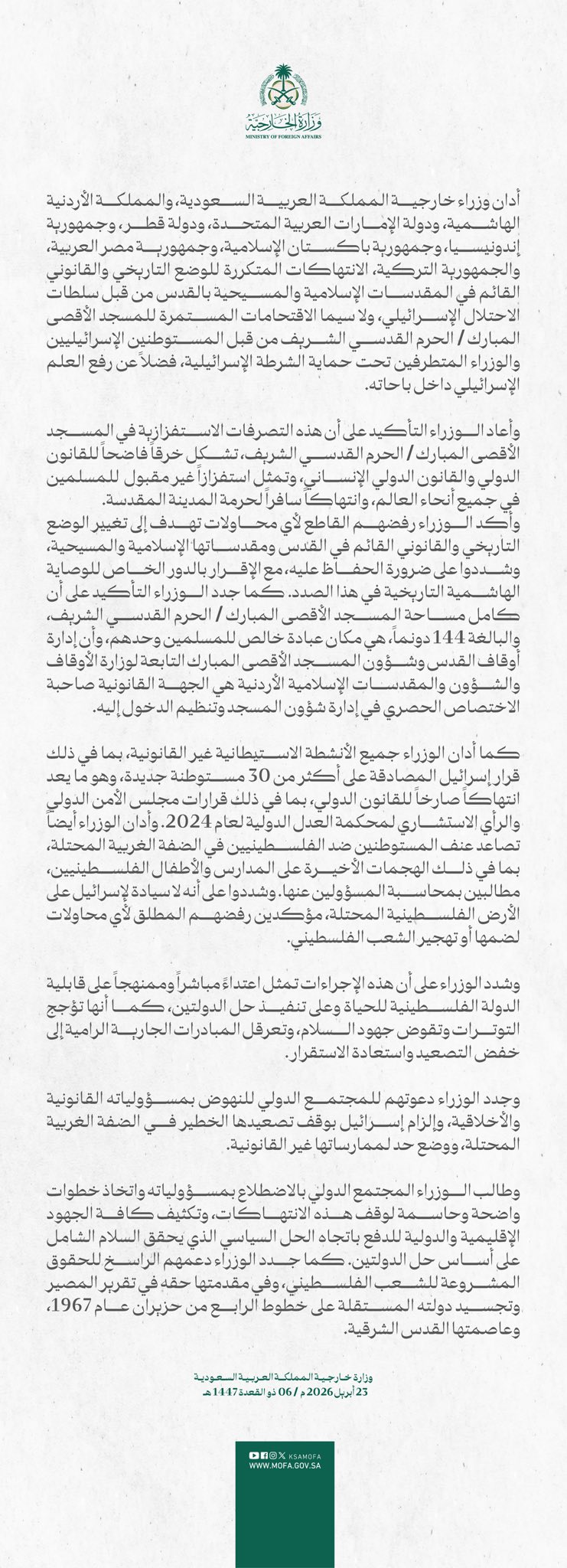 وأكد الوزراء أن هذه التصرفات الاستفزازية في المسجد الأقصى المبارك/ الحرم القدسي الشريف تمثل خرقًا فاضحًا للقانون الدولي والقانون الدولي الإنساني، واستفزازًا غير مقبول لمشاعر المسلمين في جميع أنحاء العالم، وانتهاكًا لحرمة المدينة المقدسة.